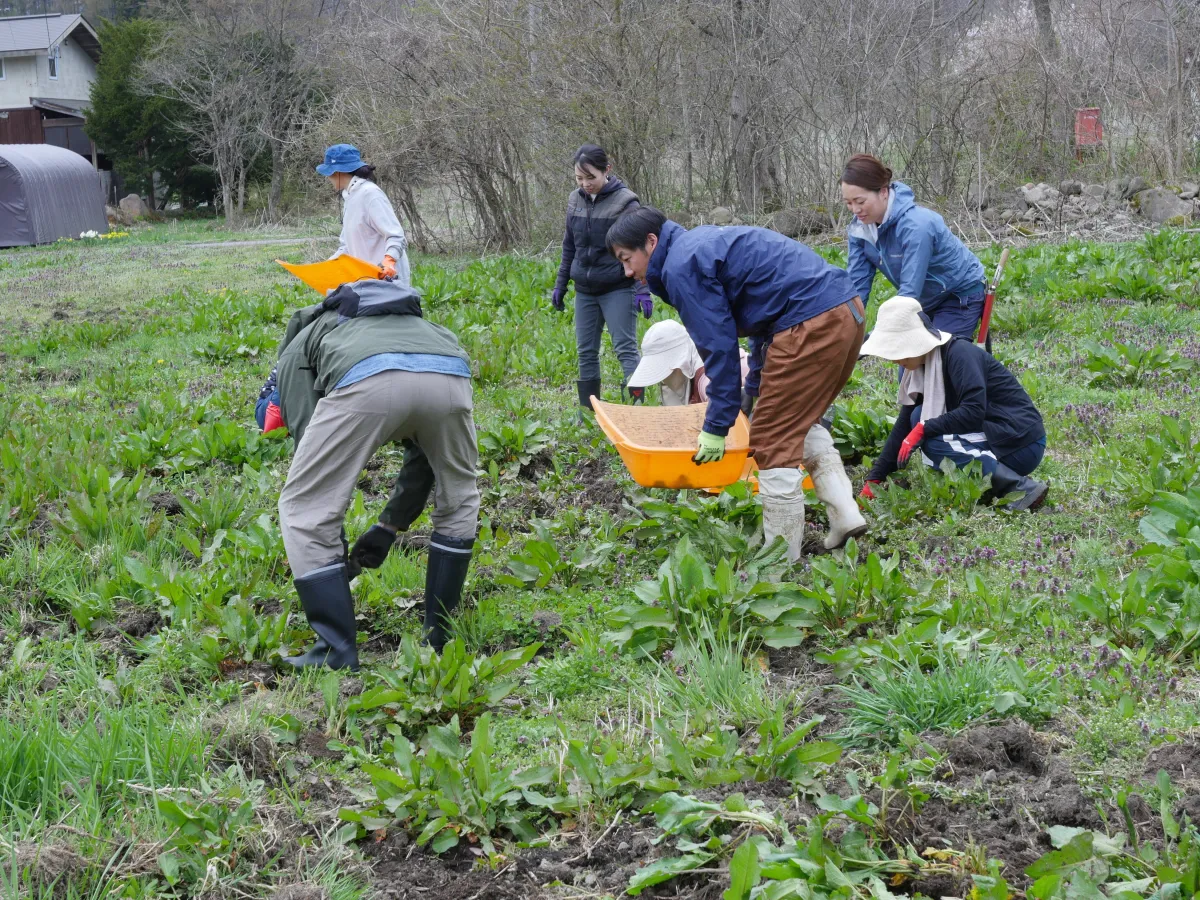森の社屋裏にある空き地では、野生のイノシシが地中の石を掘り返す影響で、石が露出していました。この状況が乗用草刈機による除草作業を困難にしてしまうため、石拾いを行いました。2023年と2025年にも継続して実施される予定で、石を取り除くことでより適切な草刈り環境を整備しています。