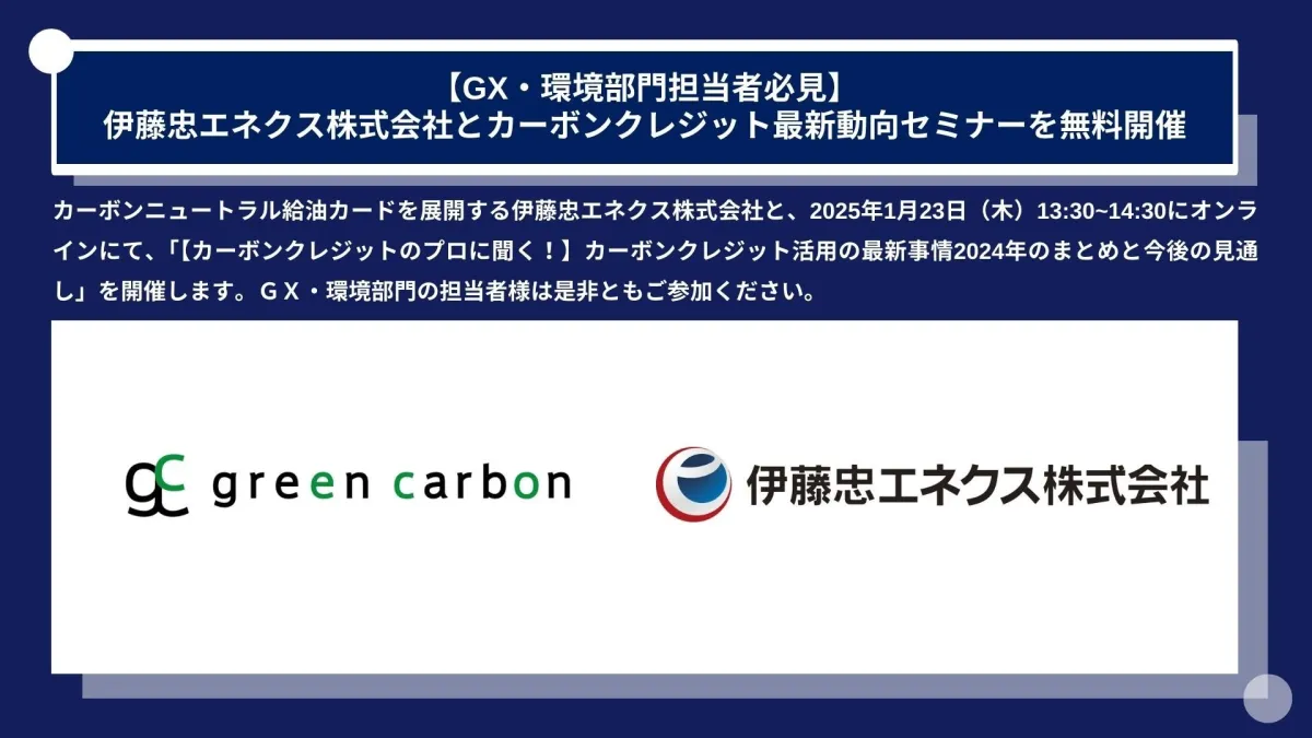 本セミナーは、2025年1月23日(木)13:30から14:30までオンラインで開催されます。共催は、カーボンニュートラル給油カードを展開する伊藤忠エネクス株式会社と、自然由来のカーボンクレジットを提供するGreen Carbon株式会社です。セミナーに参加することで、以下の内容が得られます:
