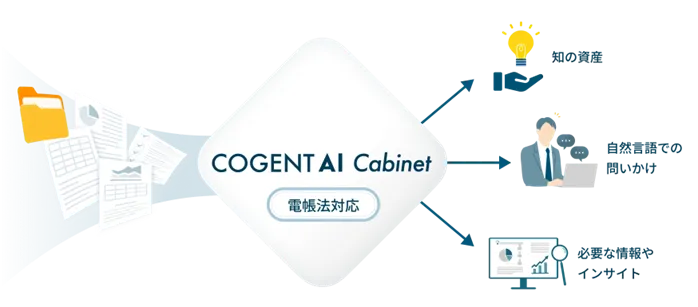 これら複雑な課題を解決するために登場したのが、「COGENT AI Cabinet」です。このAI電子保存ナレッジベースは、企業内の文書から必要な情報を瞬時に特定し、さらに抽出や要約、集計を行うことができます。情報を取り出すプロセスが迅速化し、業務の効率が格段に上がることでしょう。