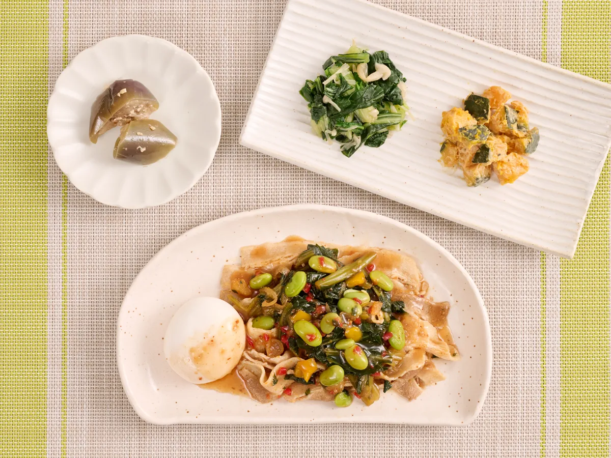 「豚と彩り野菜のピリ辛甘酢だれ」は、変わりやすい季節にぴったりな一品です。ジューシーに仕上げた豚バラ肉に、ほんのりピリ辛の甘酢だれが絡むことで、心地よい刺激を感じながら食欲をそそる味わいに仕上がっています。また、豚バラの豊かなコクに加えて、小松菜やパプリカといった色とりどりの野菜が感覚的な楽しさを提供し、生姜の香りや枝豆の食感がアクセントを加えています。そして、添えられた半熟卵をかけることで、まろやかな味の変化も楽しめるのがこのメニューの魅力です。
