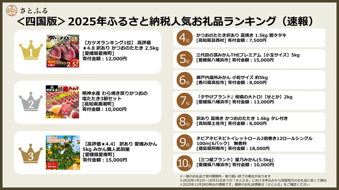ふるさと納税ポータルサイト『さとふる』を運営するさとふる株式会社が、2025年の四国版ふるさと納税お礼品ランキングを発表しました。これによると、四国地方における人気ランキングの上位3位は前年度と変わらない結果となり、その人気の高さが伺えます。
