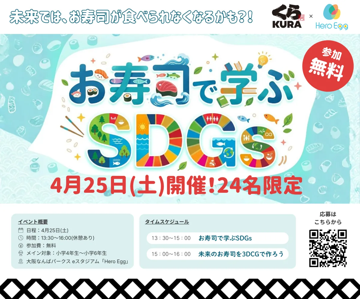 2026年4月25日、株式会社Meta Heroesが運営するDX教育施設「Hero Egg」で、くら寿司とのコラボレーションによる特別なワークショップ「お寿司で学ぶSDGs」が開催されます。このイベントは、未来の食事の形や持続可能な海洋環境について、子どもたちに考えてもらうことを目的としています。