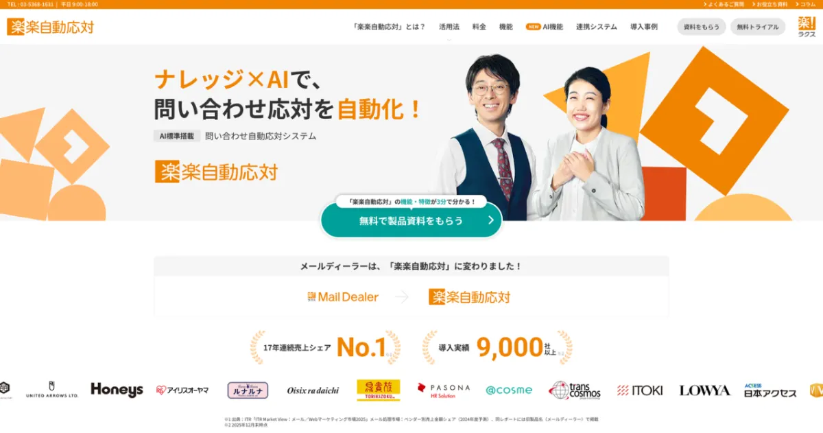「楽楽自動応対」は、AI技術を駆使した問い合わせ自動応対システムです。このシステムは、過去の応対情報をナレッジとして活用し、迅速で効果的な対応を実現します。メールに対する応対業務を自動化し、さらには応対状況を把握することで、漏れや遅延といった問題を解消します。2001年のサービス開始以来、多くのお客様のニーズに合わせて機能を進化させ、現在では9,000社以上に導入されています。また、連続して17年間、売上シェアNo.1となっています。