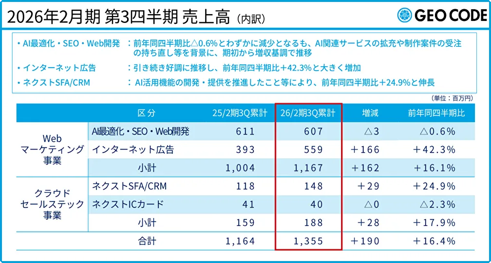 今年度の売上高は、前年同四半期比で16.4%の増加を記録しました。特に、インターネット広告は前年同四半期比で42.3%増、営業支援ツール「ネクストSFA/CRM」は24.9%の増加となり、ジオコードの成長を後押ししています。これらの結果は、AIを活用した業務プロセスの内製化や効率化が寄与していることを示しています。
