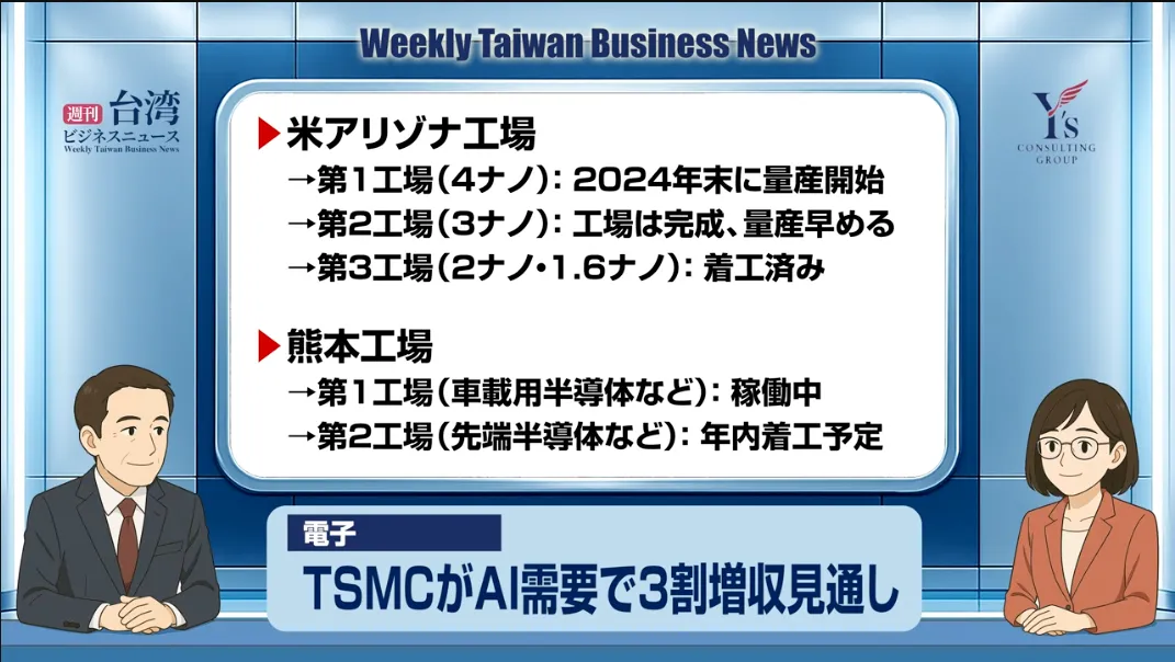 2025年に向けての台湾のビジネスシーンは、さまざまな動向が注目されており、特に人工知能(AI)需要の急増が大きな話題となっています。この需要を背景に、台湾の半導体製造大手であるTSMC(台湾積体電路製造)の売上高見通しが、前年から30%増へと上方修正されました。この変化は、AI技術の発展と関連の半導体需要の高まりが大きく影響していることを示しています。