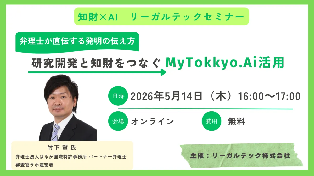 2026年5月14日(木)に、知的財産(知財)とAIをテーマにしたオンラインセミナー「知財×AIリーガルテックセミナー」が開催されます。本セミナーは、弁理士法人はるか国際特許事務所の竹下賢氏を講師に迎え、発明者と知財部門、特許事務所との効果的なコミュニケーション方法を探る内容です。参加は無料で、Microsoft Teamsを使用して行われます。