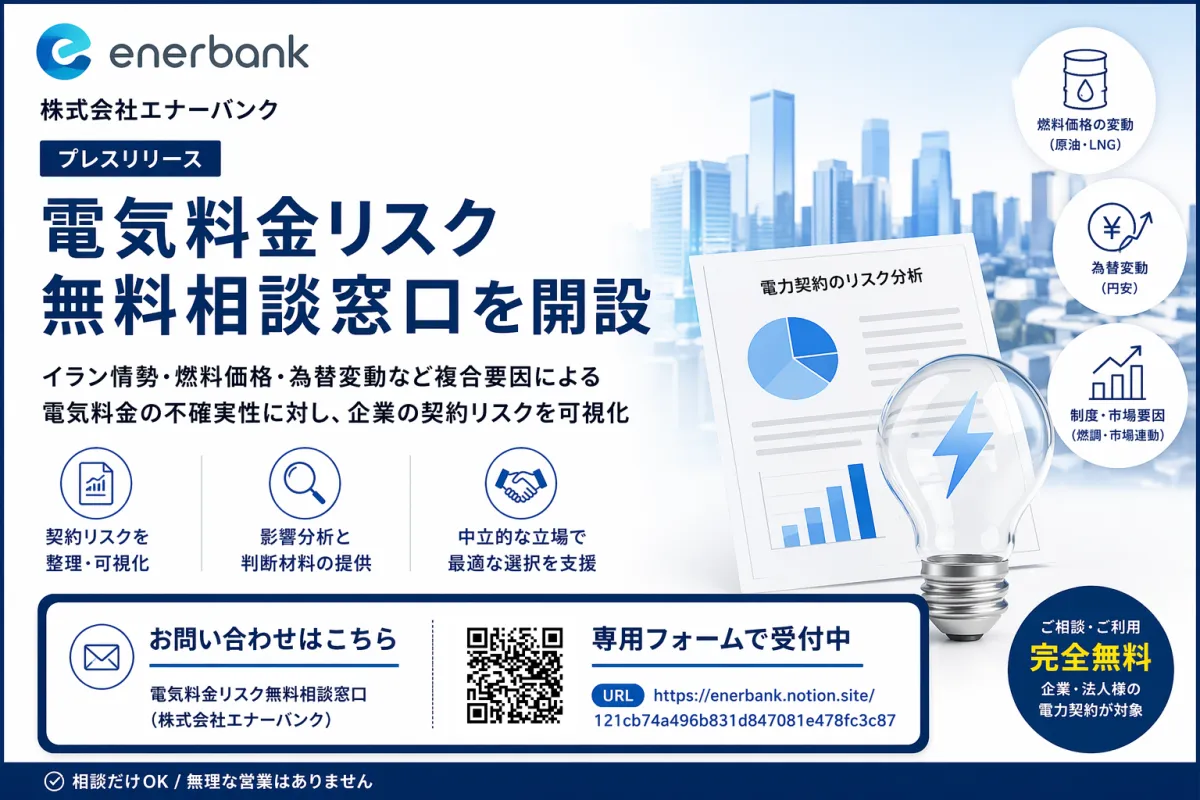 株式会社エナーバンクは、企業の電力コスト上昇リスクへの対応を目的とした「電気料金リスク無料相談窓口」を開設しました。このサービスは、国際情勢の変化、特にイラン情勢が影響を与えた電力市場の不透明な状況を背景にしたものです。燃料価格や為替変動による影響を受けて、企業の電気料金は予測が困難な状況にあり、エナーバンクはこれに対して的確な情報を提供することで企業を支援します。