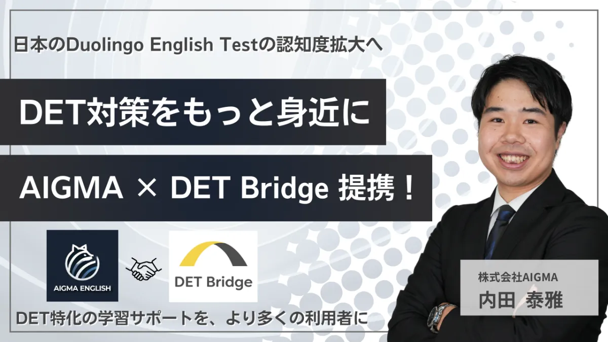 Duolingo English Test(DET)は、海外の大学や教育機関での採用が広がりつつある新しいタイプの英語試験です。日本ではまだあまり知られていませんが、コストや利便性においてメリットが多く、今後の受験者増加が期待される試験とされています。AIGMAは、この試験に特化した専門塾を運営しており、その方向性とクラクモのDET Bridgeが提供する問題演習プラットフォームは見事に合致しています。