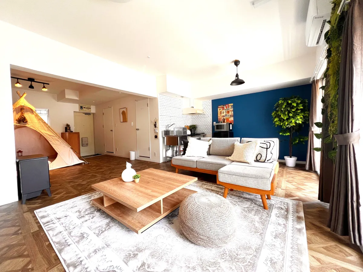 「Bespoke_Living東川口」は、東川口駅から徒歩4分という便利な立地に位置し、約50平米の広々とした1Rスペースを提供しています。最大で8名まで利用できるため、家族や友人とのホームパーティに最適です。施設内には、リラクゼーションエリアにテントを設置し、プロジェクターを使った映像鑑賞も可能。また、キッチンエリアも完備されているため、自宅のように心地よい時間を過ごすことができます。