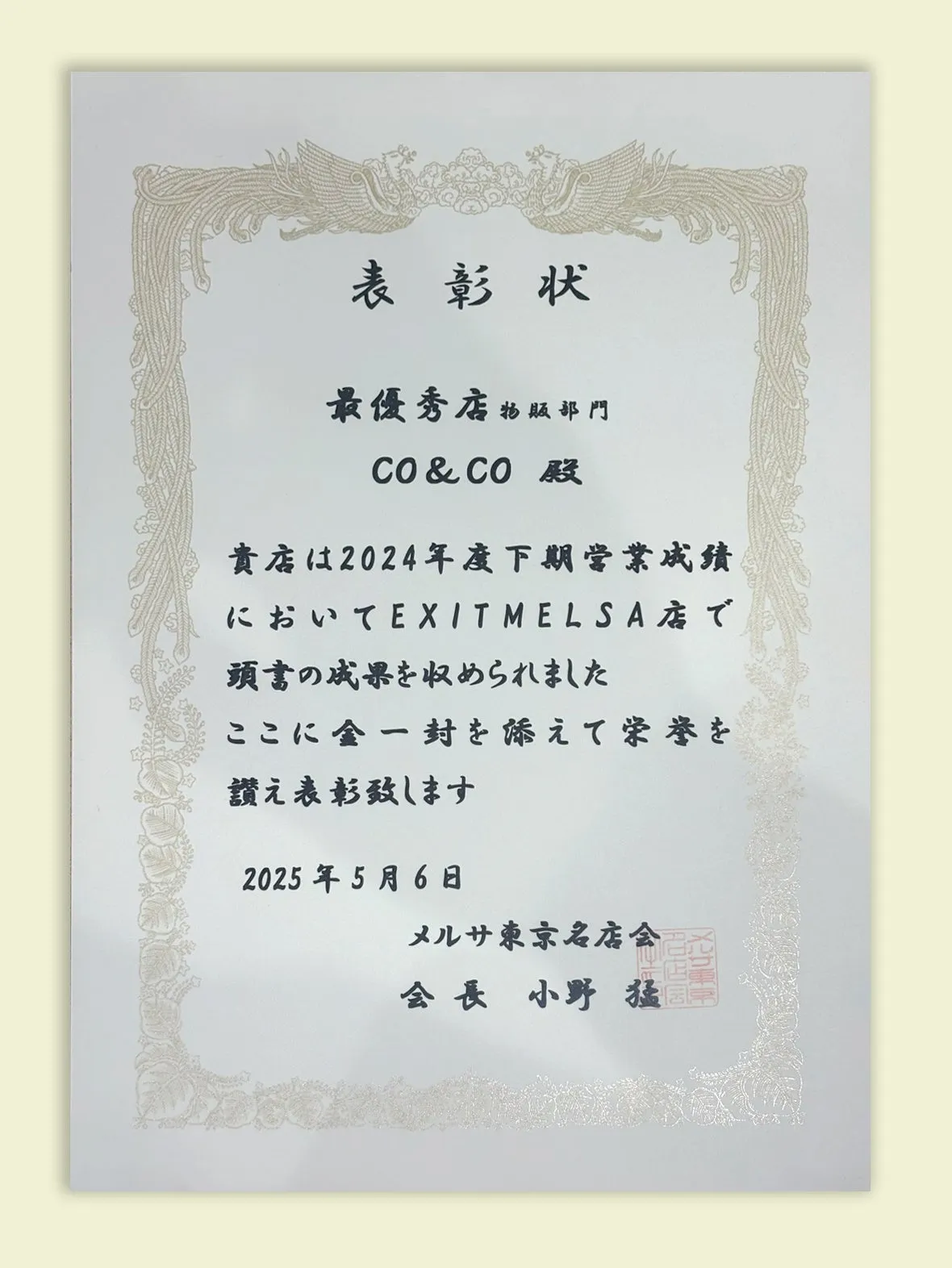 この受賞は、同店が提供する高品質なアイテムと確かなサービスの証と言えるでしょう。お客様に感謝の意を込めて、銀座EXITメルサより贈られた表彰状は、信頼と品質の象徴とも言えるものです。