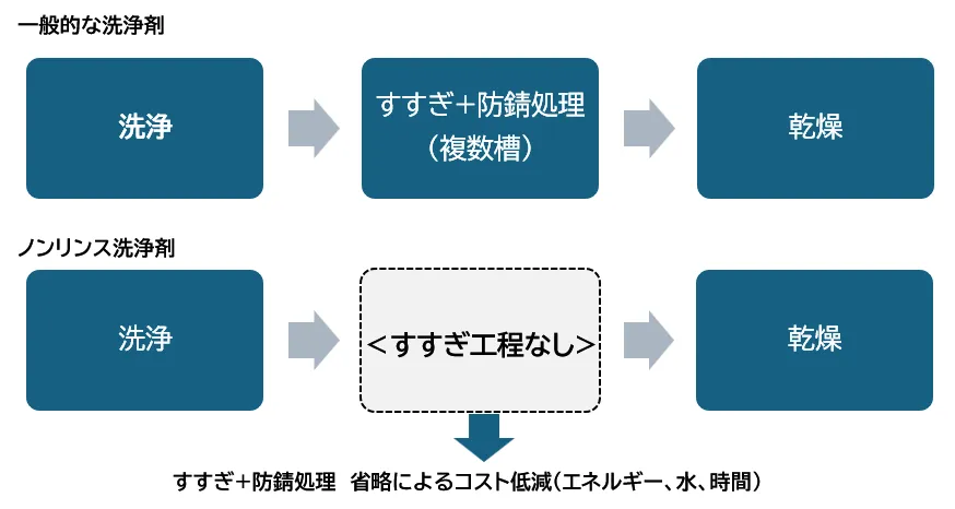 自動車部品製造や他の金属加工現場では、加工油や研磨粉を取り除くための洗浄工程が不可欠ですが、これには大量の水を使用し、長時間を要することが常です。また、錆びやすい金属の場合、洗浄後に防錆処理を施す必要もあり、コストや作業負担は増えていきます。これまで、第一工業製薬はアルカリ性のノンリンス洗浄剤を提供してきましたが、最近では中性タイプへのニーズが高まっています。