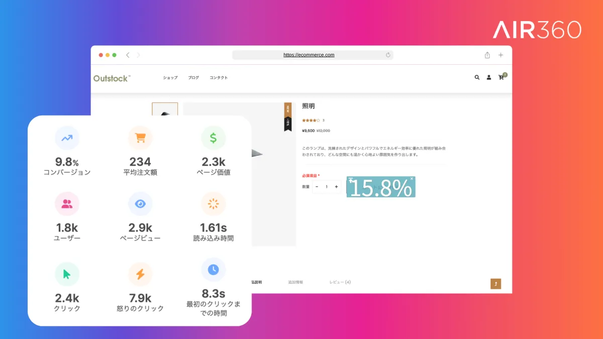 Air360は、ウェブサイトを訪問するユーザーの行動を瞬時に分析し、彼らのニーズに対してどのように改善が必要かを示すデジタル体験分析ツールです。ユーザーのストレスや離脱理由を簡単に解析でき、導入もノーコードでスムーズに行えるため、企業にとって大きなメリットとなります。