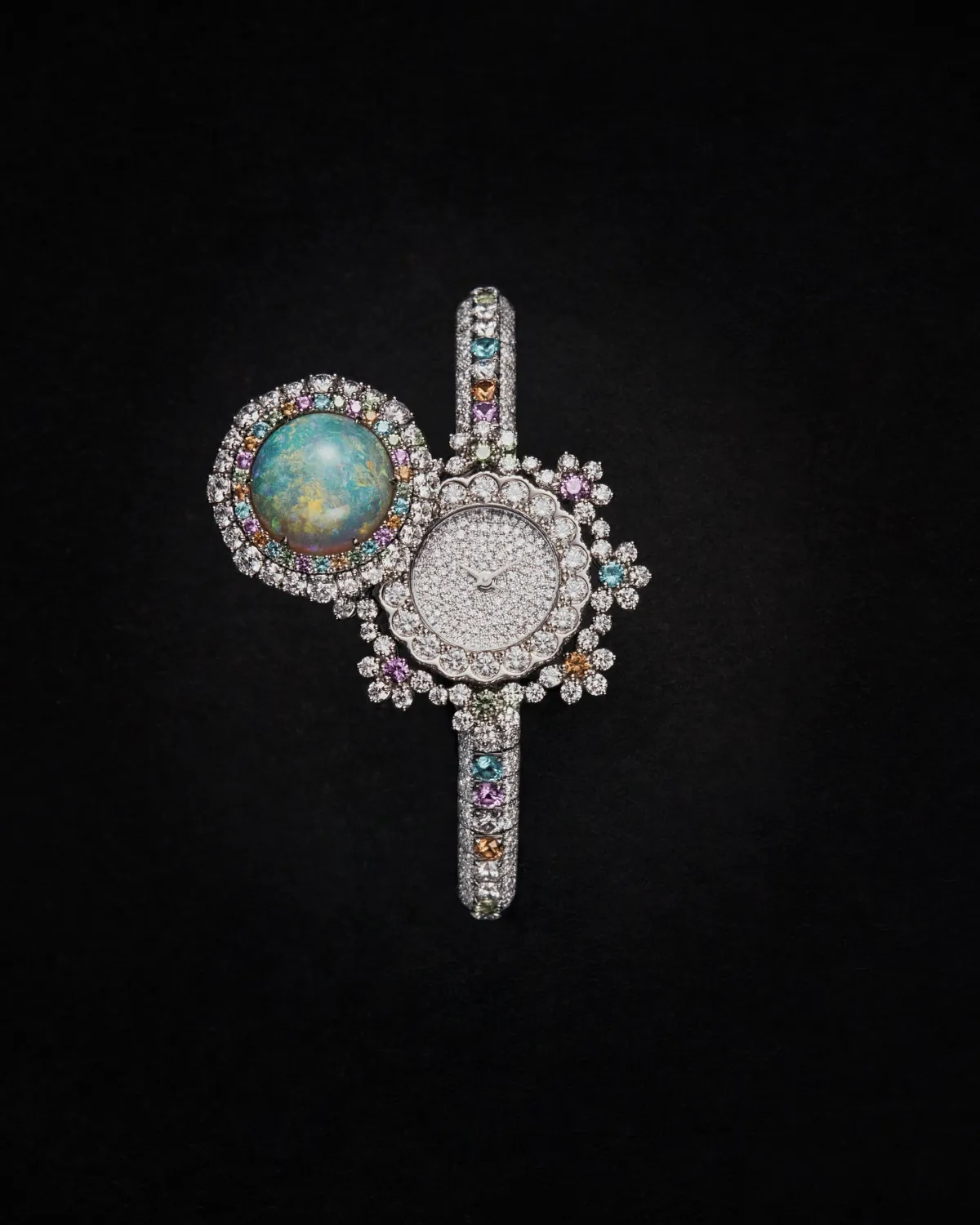 ホワイトゴールドで仕立てられ、1398石のブリリアントカットダイヤモンドと貴石が手作業でセットされた花モチーフが特徴です。このデザインは、ブランド創設者であるムッシュ ディオールの自然への尊敬の念を表現したものです。これほどまでに緻密に作り込まれた時計は、身に着けるだけでなく、まるでアート作品としても楽しむことができます。