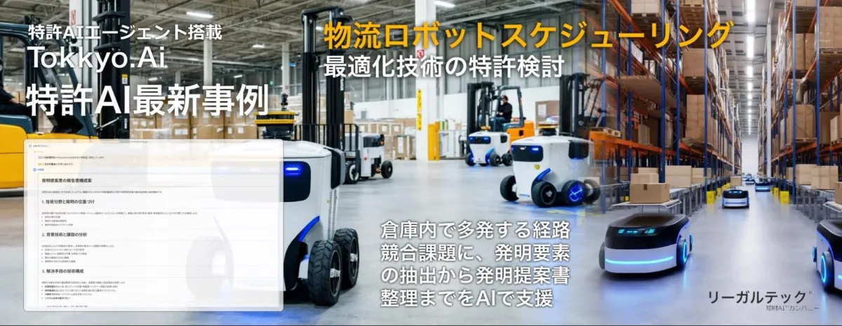 今後、物流ロボットにおいては、単体性能の向上だけでなく、ロボット群全体の協調制御やスケジューリングが競争力のかぎとなります。「MyTokkyo.Ai」を活用することで、複雑なシステム制御に関する研究開発の促進が期待されるでしょう。リーガルテック株式会社は、物流や製造、インフラといった広範囲な分野で企業の研究開発を支援し、知財活動を強化する特許AIエージェントとしての役割を果たしていく所存です。