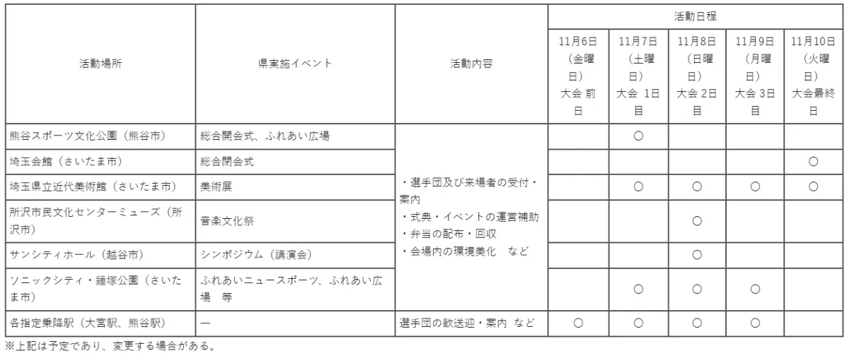この特別な機会に、埼玉県内からのボランティアを募集する運びとなりました。ボランティアの方々には、全国から集まる選手や来場者を心のこもったおもてなしでお迎えし、円滑な大会運営に協力していただきます。