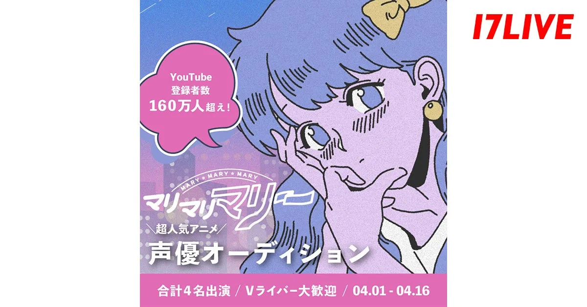 2025年4月1日より、17LIVE株式会社が主催する『大人気YouTubeアニメ‘マリマリマリー’声優オーディション』が開催されます。このオーディションは、YouTubeとTikTokで大人気の短編アニメ「マリマリマリー」とのコラボレーション企画で、短期間で多くの支持を集めているアニメ作品から派生したものです。