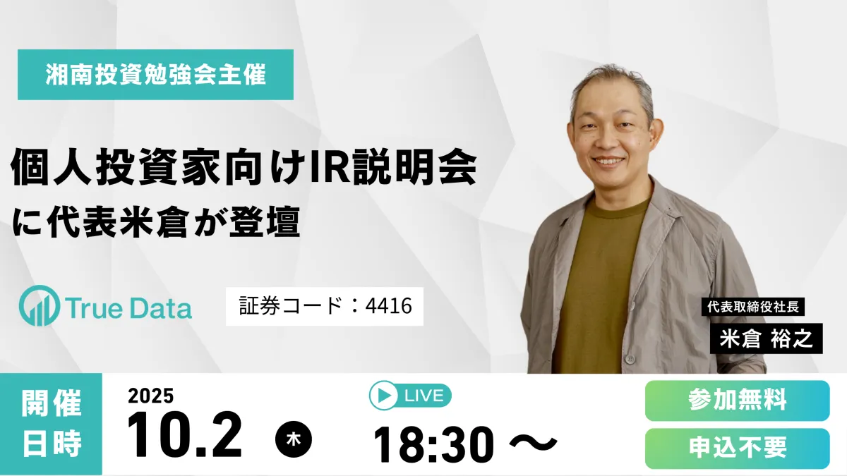2025年10月2日、株式会社True Dataは湘南投資勉強会が主催する「個人投資家向けIR説明会」に参加します。この機会に、当社の代表取締役社長である米倉裕之が登壇し、会社の事業内容や今後の成長戦略を詳しくお話しします。