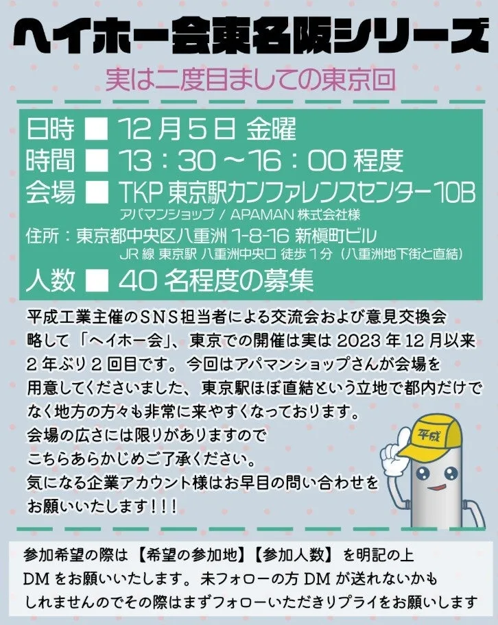 「ヘイホー会」は、SNS活用を推進するために情報共有を促進し、実務に役立つ知見を深めることを目的とした交流イベントです。2023年にスタートしたこの企画は、東京では約2年ぶりに開催されます。会場は東京駅八重洲口から徒歩1分というアクセスの良さが魅力です。