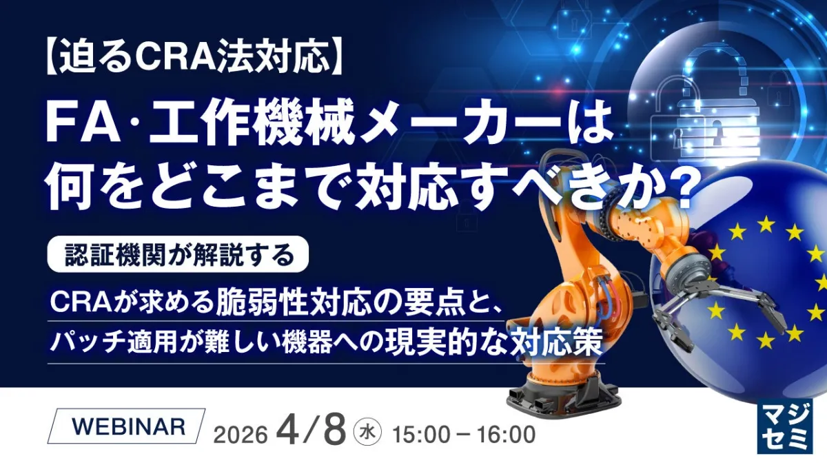 今回のウェビナーでは、テュフズードジャパンを講師に迎え、CRAが要求する脆弱性への対策について解剖します。特に、評価の観点から見た脆弱性へのアプローチや、FA機器メーカーが押さえるべき実務ポイントが示される予定です。また、長期稼働が前提の製品への適用方法についても触れられるため、自社の製品に対する具体的な対応策を見つける手助けとなるでしょう。