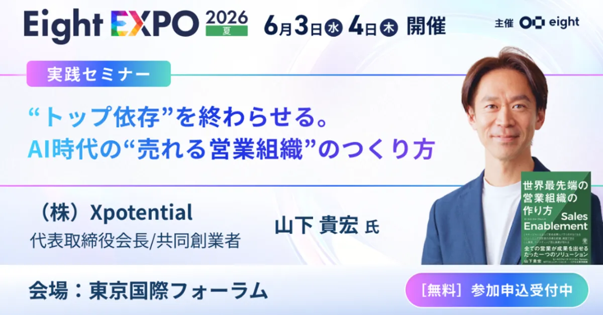 2026年6月3日と4日に開催される「Eight EXPO2026@国際フォーラム」で、株式会社Xpotentialの会長である山下貴宏氏が登壇します。このイベントでは、営業組織の革新に必要な要素について深く掘り下げられる予定です。