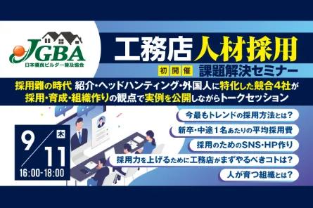 2023年9月11日、一般社団法人日本優良ビルダー普及協会(JGBA)主催の「工務店人材採用課題解決セミナー」がリアルとオンラインを組み合わせた形式で開催されました。このセミナーは、地域密着型の工務店が直面する人材不足問題に対処するための情報共有と実践的な知見を集めたもので、30名の参加者が集まりました。
