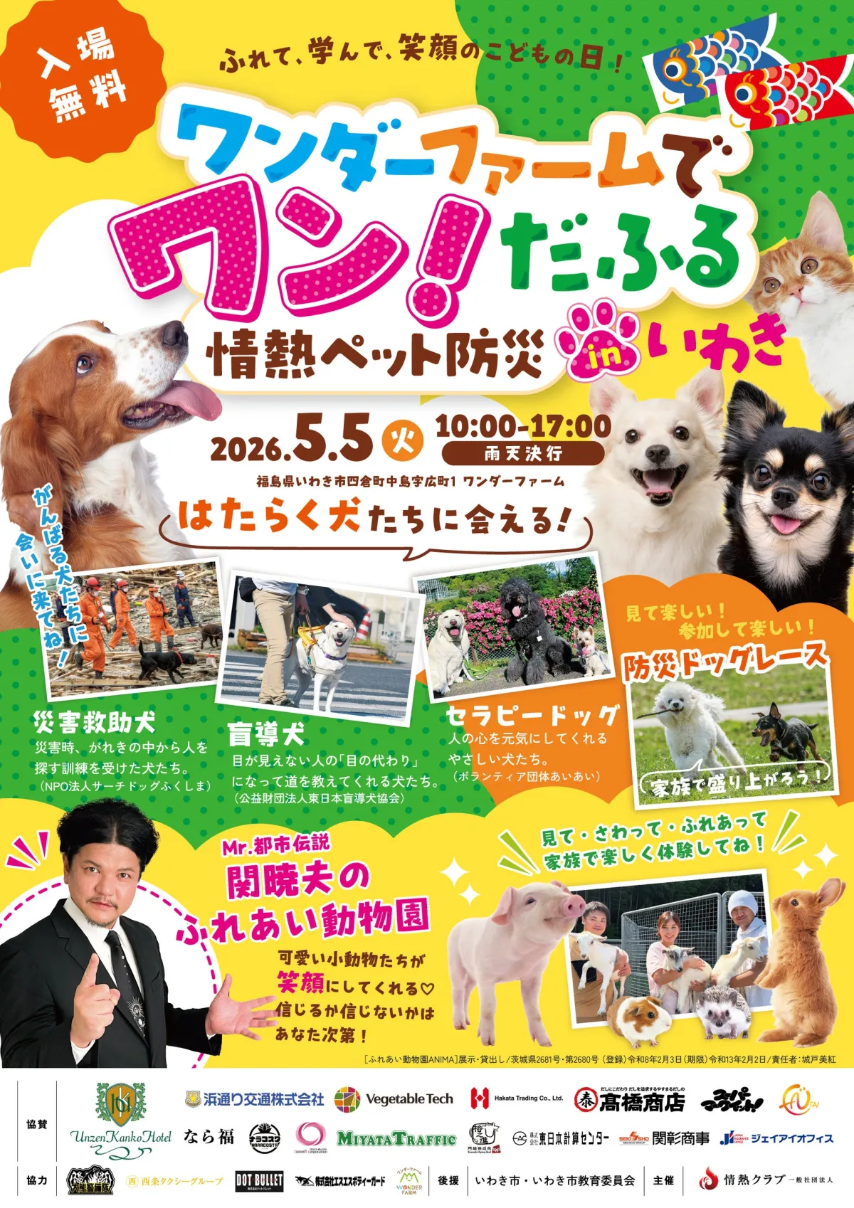 福島県いわき市で5月5日に開催される「ワンダーファームでワン!だふる 情熱ペット防災」は、ペットを持つ家族向けの体感型防災イベントです。このイベントでは、東日本大震災の教訓を踏まえた実践的な防災知識が学べるだけでなく、タレントのMr.都市伝説 関暁夫さんも参加します。主催する情熱クラブ一般社団法人は、ペットと一緒に避難する「同行避難」を普及させ、地域のコミュニティを活性化することを目指しています。
