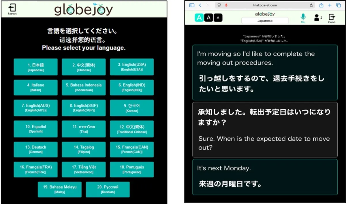 対面でのコミュニケーションには、即時性が求められます。そのため、「globejoy」の対面版は、来訪者と窓口担当者が希望する言語を選ぶだけで、すぐにコミュニケーションを開始できるインターフェースを採用しています。これにより、迅速な対応が実現可能です。