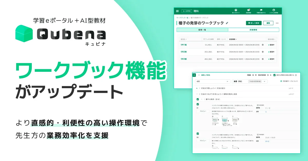 現在、GIGAスクール構想の第2期「NEXT GIGA」が進行中であり、その中でICT環境の整備やデジタル学習基盤の活用の質が重要なテーマとされています。キュビナはこのような背景の中で、子どもたちにとっても教員にとっても「活用しやすい」教材として開発されてきました。特に、「ワークブック」機能は問題リストの作成や配信が可能で、多くの学校で活用されています。