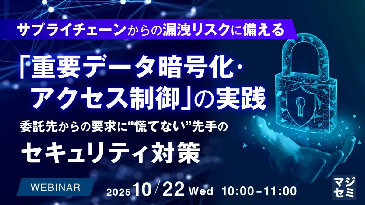 このような背景のもと、企業はすべてのサプライチェーン関連企業が「重要データを確実に保護する体制」を整え、高まるセキュリティ要件に応じた対策を講じることが求められています。本ウェビナーでは、「重要データの暗号化とアクセス制御」をテーマに、企業が実施すべき具体的な対策やその重要性について解説します。