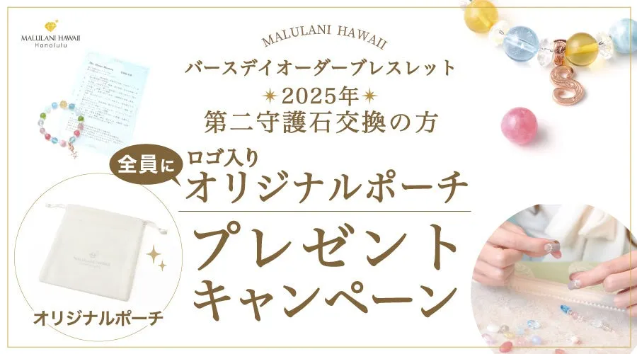 2025年2月1日より、バースデイオーダーブレスレットの第2守護石を交換したお客様には、マルラニハワイのロゴ入りオリジナルポーチがプレゼントされます。このポーチは限定デザインで、数に限りがあるため、早めの申し込みがおすすめです。特別なこのポーチと共に、あなたを応援してくれるストーンを迎えて、素晴らしい一年を過ごしてみませんか?