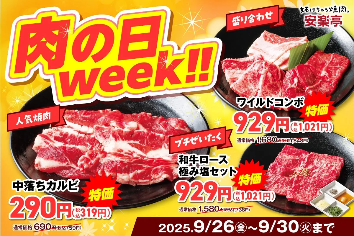 季節が食欲を誘う秋。そんな中、焼肉が恋しくなる時期がやってきました。毎月29日は「肉の日」。この日を記念して安楽亭では、毎月恒例の“肉の日week”を開催します。今回は、9月26日から30日までの間、人気の焼肉メニューを特別価格で提供します!