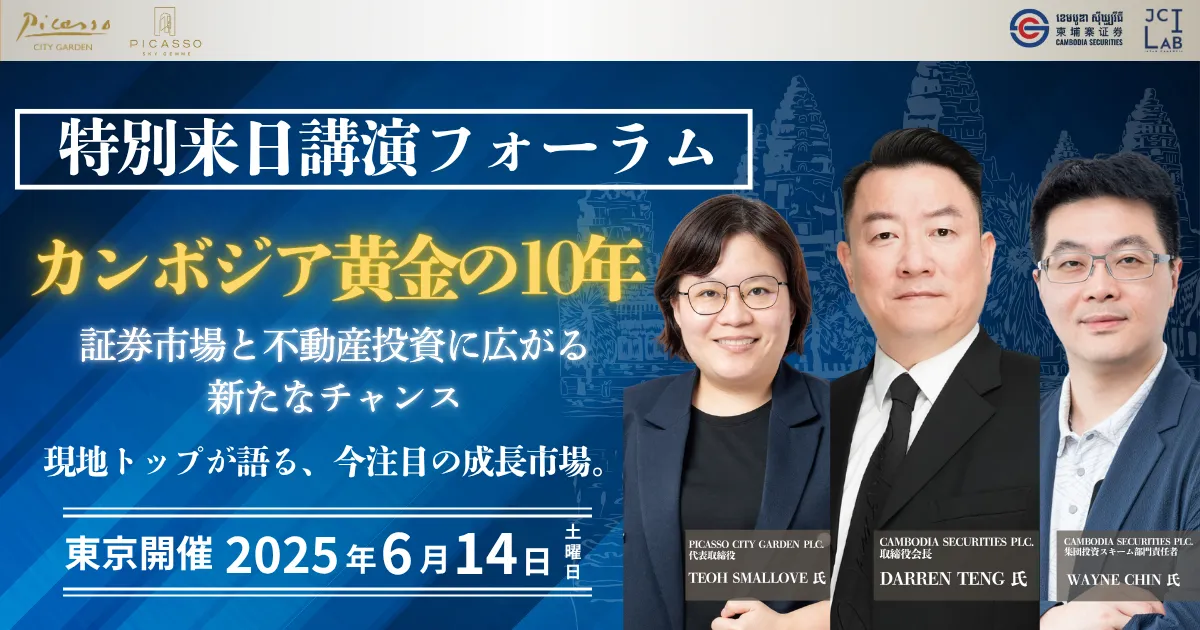 2025年6月14日、東京・紀尾井カンファレンスで開催される「カンボジア黄金の10年 ~証券市場と不動産投資に広がる新たなチャンス~」は、急成長中のカンボジア市場に焦点を当てた特別な機会です。このフォーラムは、カンボジアの不動産開発を手がけるPicasso City Garden Development Plc.が主催し、JCI LABと主要証券会社のCambodia Securities Plc.が共催する形で行われます。