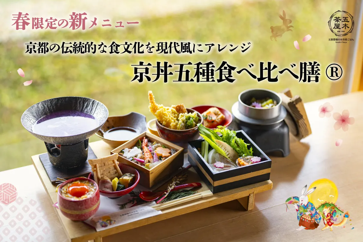 2026年3月1日より、五穀豊穣のお茶屋ごはん五木茶屋 伏見稲荷店は、春限定の「春の京丼五種食べ比べ膳」を販売開始しました。このメニューは、春の訪れを感じさせる特別な御膳で、京野菜や旬の山海の幸を活かした華やかな盛り付けが魅力です。
