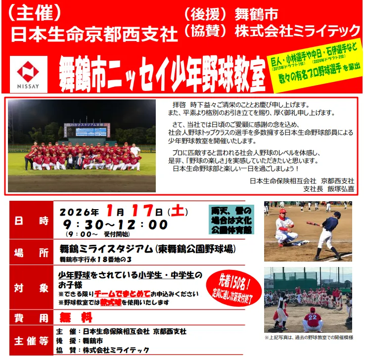 2026年1月17日、京都の舞鶴ミライスタジアムにおいて、日本生命野球部が主催する「ニッセイ野球教室」が開催されます。このイベントは、地域の小学生を対象にしたもので、参加者は現役のプロ選手から直接指導を受けることができる貴重な機会です。