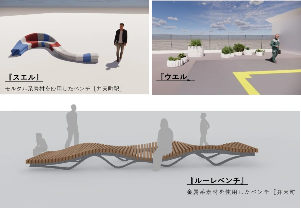 これらは、特に固有な設計がされており、モルタル系素材を用いて、一般的な材料と比較して約20%の削減が実現されています。弁天町駅周辺の寺社文化や川の流れをイメージし、ベンチのデザインは「うねり」を表現しています。