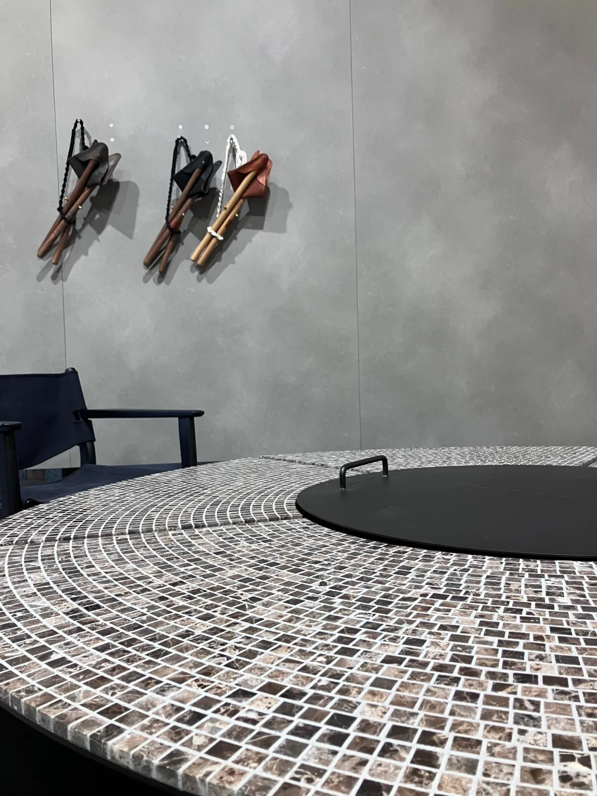 テーブルの天板には、天然石から作られたモザイクタイルが全面に敷かれており、その自然な凹凸が、中央の炎のゆらぎを美しく反射します。これは、ただの焚き火台ではなく、空間全体を引き立てる上質な演出を実現しています。元々の天然大理石ならではの色合いや質感は、すべて異なり、二つとして同じものは存在しないため、それぞれが唯一無二の風合いを持っています。このように、タイルの表情が空間に深みを与え、一層魅力を増します。