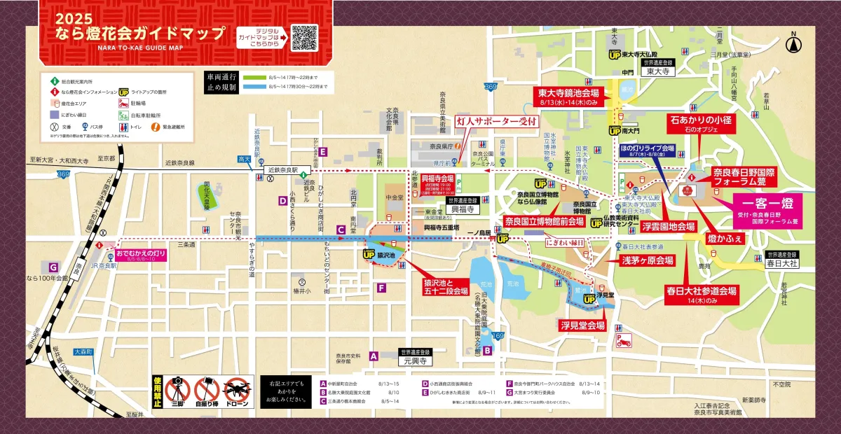2025年8月5日から始まる第27回なら燈花会では、「2025 なら燈花会ガイドマップ」の提供をスタートします。これはGPS連動型のデジタルマップで、奈良公園一帯に広がる9つの燈花スポットや注目ポイント、そしてアクセス方法をスマートフォンで簡単に確認できます。これまでの紙マップでは味わえなかったリアルタイムな情報が利点です。