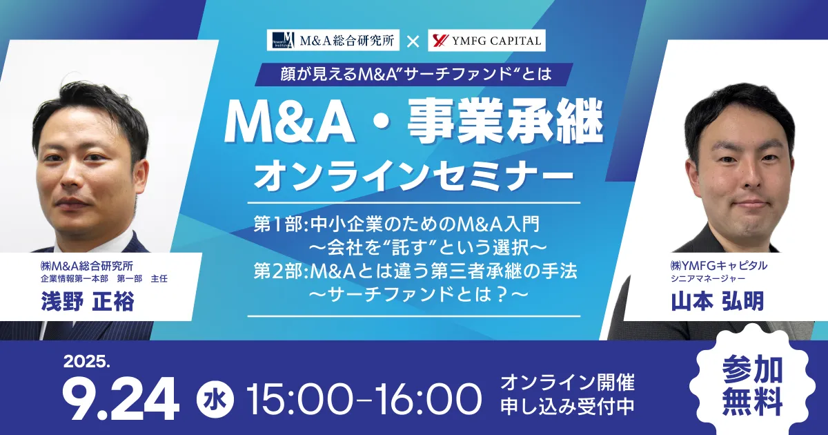 株式会社M&A総合研究所とYMFGキャピタルが共に手掛ける新しいM&A手法、サーチファンドに関するオンラインセミナーが開催されます。本セミナーでは、サーチファンドという手法がどのように機能するのか、M&Aとの相違点、さらには実際の活用事例についても詳しく解説します。