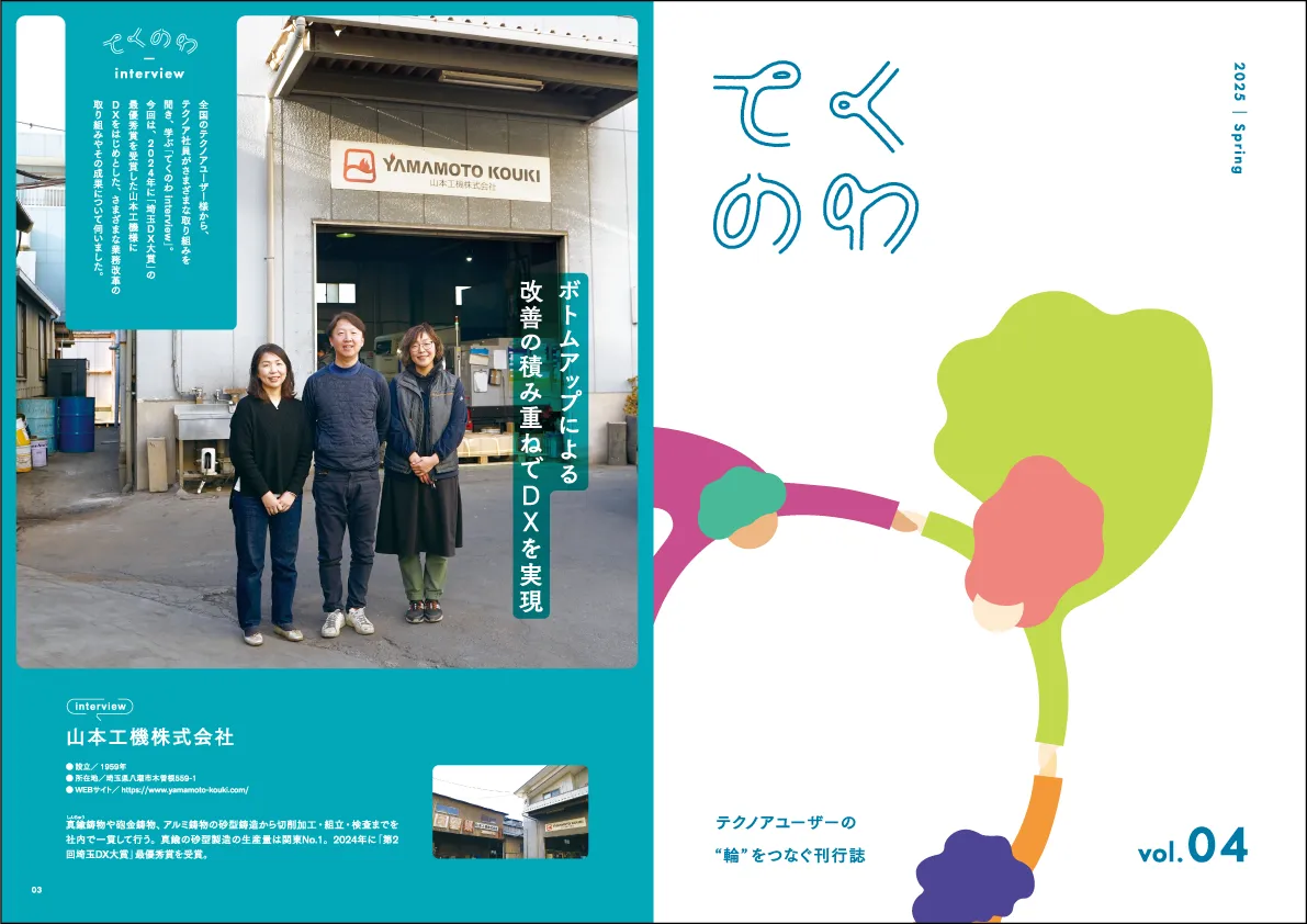 最新号のvol.4では、2024年に埼玉DX大賞で最優秀賞を受賞した山本工機株式会社に焦点を当てています。この企業の代表、山本成年氏へのインタビューが掲載され、同社のデジタルトランスフォーメーション(DX)と業務改革の取り組みについて詳細に紹介しています。特に、ボトムアップ方式による改善の重要性や成果が取り上げられており、読者にとって貴重な学びの機会となるでしょう。