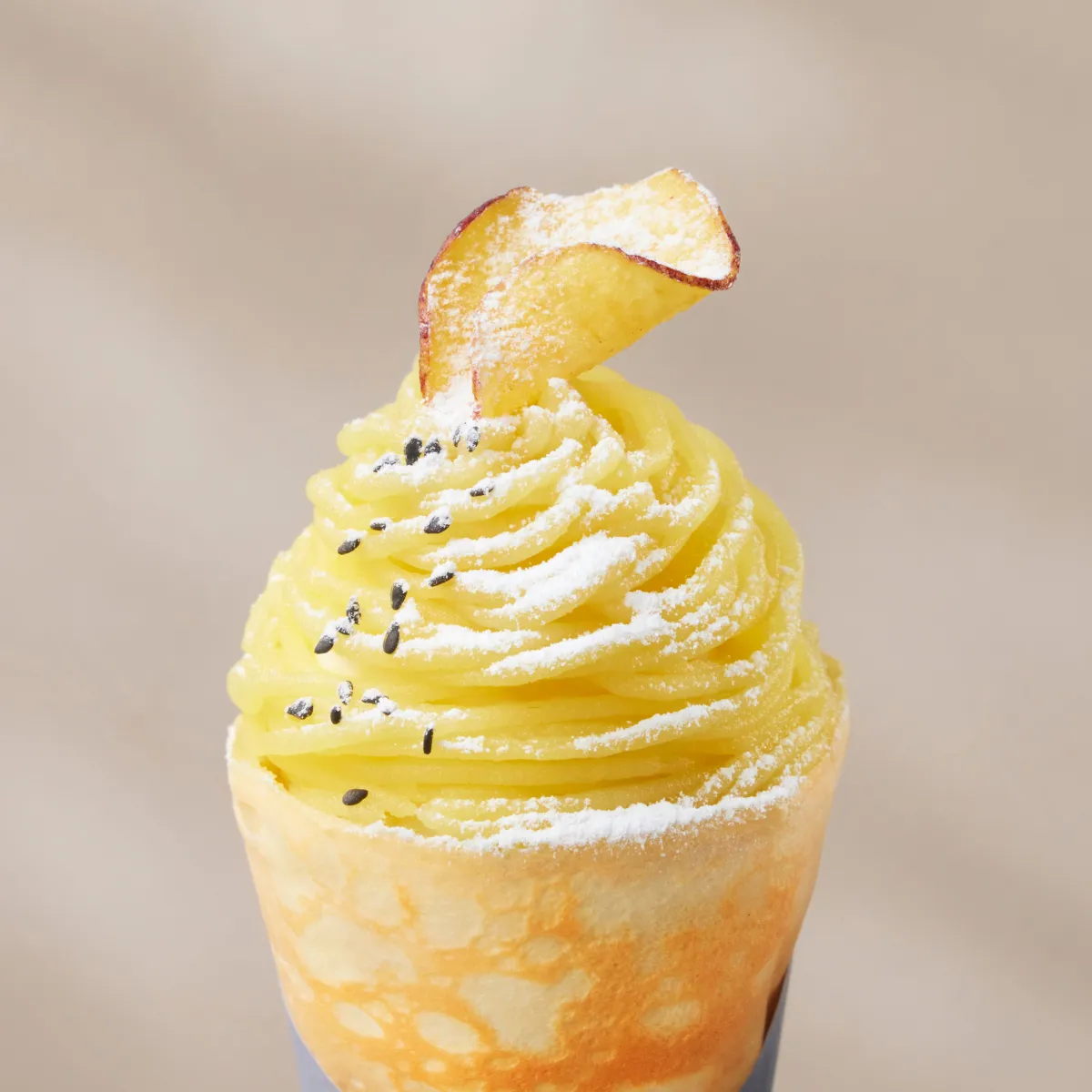 さらに、素晴らしいスイートポテトアイスクリームと、香ばしく焼き上げたサツマイモチップが重ねられ、粉雪を思わせるシュガーパウダーで仕上げられています。このビジュアルは、ひと目見ただけで冬の情景を思い起こさせ、食べる前から期待感が膨らむことでしょう。
