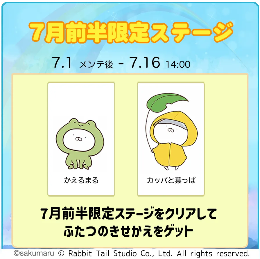 この限定ステージに参加すると、特別な能力を持つ着せ替えアイテムを手に入れるチャンスがあります。対象のステージをクリアしたプレイヤーには、人気キャラクター「かえるまる」と「カッパ」の着せ替えが授与されます。ステージは、2025年7月1日(火)のメンテナンス終了後から7月16日(水)の14:00までの間で楽しめます。