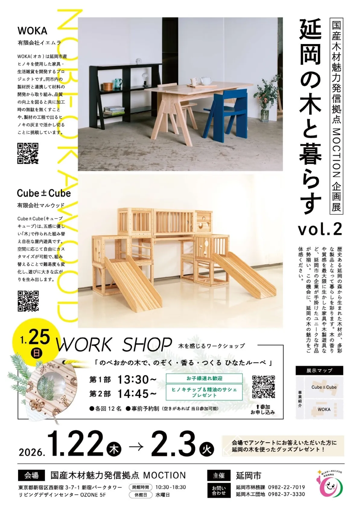 延岡市が新宿区の国産木材情報発信拠点「MOCTION」にて、木材とものづくりをテーマにした特別展示を行います。今回の企画展「延岡の木と暮らす vol.2」では、延岡の森林資源を活かした取り組みが紹介されます。