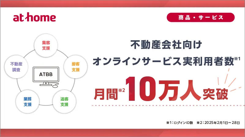 アットホーム株式会社(東京都大田区、代表取締役社長:鶴森康史)は、この度、同社が提供する不動産会社向けのオンラインサービス『ATBB(不動産業務総合支援サイト)』の月間実利用者数が10万人を突破したことを発表しました。この数字は、2025年2月1日から28日までの期間におけるログインID数に基づいています。