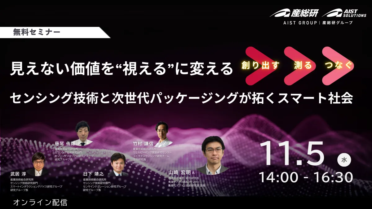 産総研は、2025年11月5日(水)に「センシング技術・次世代パッケージングコンソーシアム」に関するオンラインウェビナーを開催します。このイベントでは、株式会社東芝総合研究所の山﨑氏を招き、高度なセンシング技術の研究開発の最新動向について伺います。また、各ワーキンググループの代表者が研究活動や社会実装に向けた取り組みを発表するほか、パネルディスカッションを通じて産学連携や社会実装の課題についても深堀りします。参加費は無料で、興味のある方はぜひ参加をご検討ください。