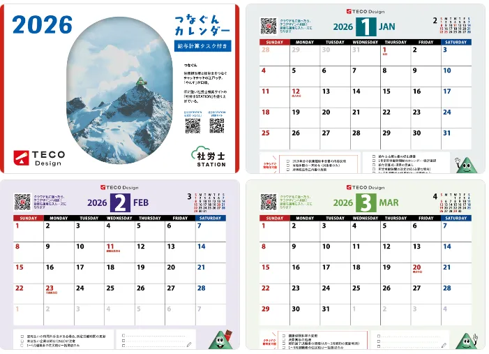 - - 配布物:給与計算タスク付き2026年つなぐんカレンダー