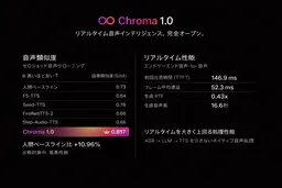 Chroma 1.0は、この問題を解決するために独自の「Speech-to-Speech(S2S)」設計を採用しています。この技術により、音声を音声のまま処理することができ、147ミリ秒以下でリアルタイムの対話が可能です。