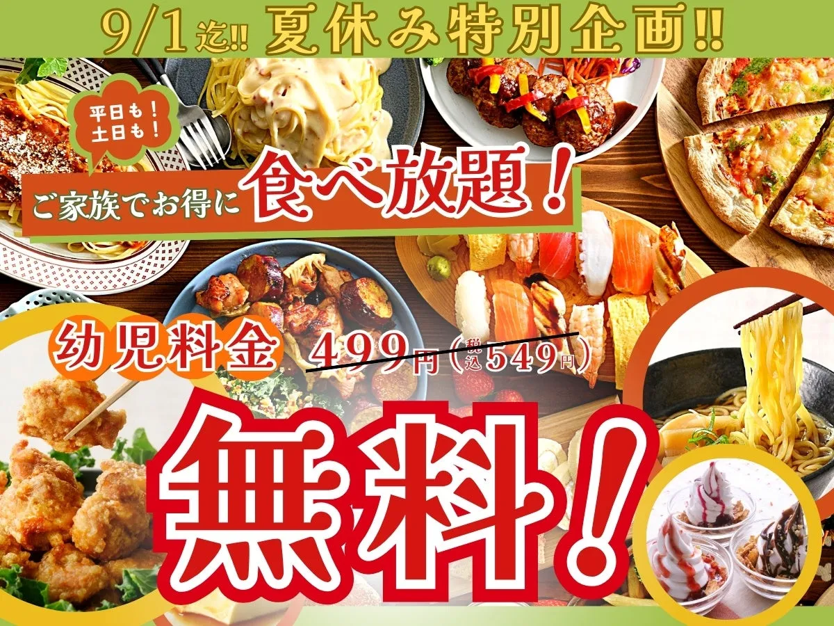 この夏、家族でのお出かけを計画している方に朗報です!ニラックスブッフェでは、2024年7月25日から9月1日(日)までの特別企画として、幼児(通常499円)料金がなんと「無料」となります!この機会に、食べ放題をぜひ満喫してください。