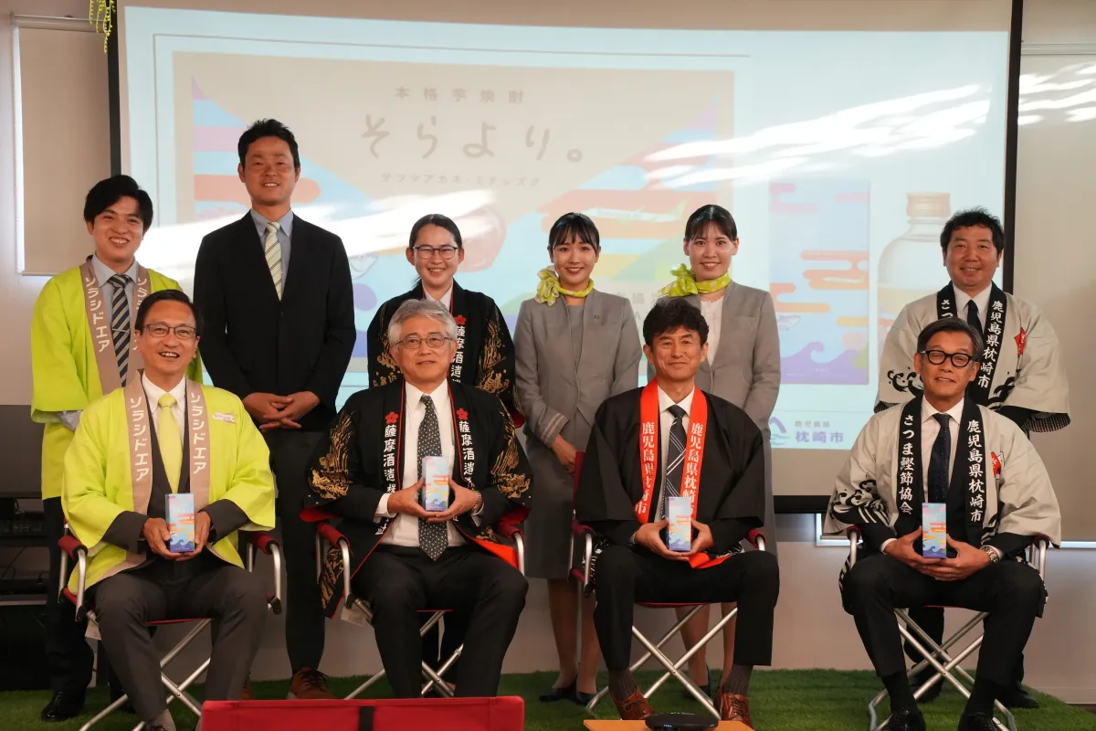 「そらより。」は、枕崎市の地域の課題を解決するために開墾された「ソラシドファーム枕崎」で育てた鹿児島県産の「サツマアカネ」と「みちしずく」を使用。柑橘系や紅茶のようなフルーティーな香りが特徴で、初心者から焼酎ファンまで楽しめる飲みやすさを兼ね備えています。お披露目会では、地元の皆さんの強い思いが込められた乾杯で、この焼酎の発売を祝いました。