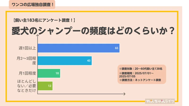 今回の調査では、どのくらいの頻度で愛犬をシャンプーしているかという質問に対し、最も多かったのは「週1回以上」の65票でした。これは、室内飼いが増える中で、愛犬の清潔さを保ちたいという飼い主の気持ちを反映しています。一方で、皮膚や被毛の健康を考慮しつつ、月に2~3回と答えた人も43票見られ、適度な洗浄を意識していることが示されました。