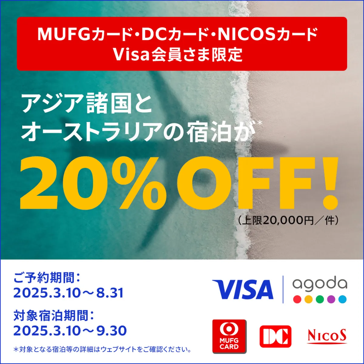 このキャンペーンでは、オンライン旅行予約サイト「Agoda」を通じての宿泊予約が対象です。提供される宿泊施設やプランは、国内外を含む多様な選択肢があります。特に注目すべきは、アジア諸国やオーストラリアでの宿泊料金が最大20%割引となる点です。これにより、旅行者は魅力的な料金での宿泊が実現できます。具体的には、割引金額は一回の宿泊で最大20,000円に上ります。